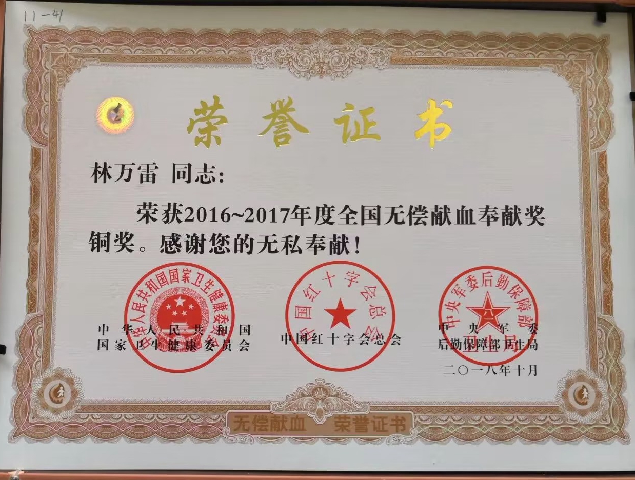 自2007年开始,林万雷坚持定期献一次血,从未间断,献血量达7000余毫升,被授予“全国无偿献血奉献奖”荣誉称号。“每400毫升血液可以救助一条生命,我很自豪我帮助了那些有需求的人,挽救了他人的生命”,他说,只要我的血液合格,无偿献血我将会坚持一辈子。