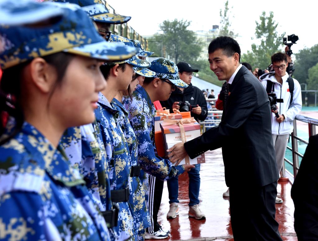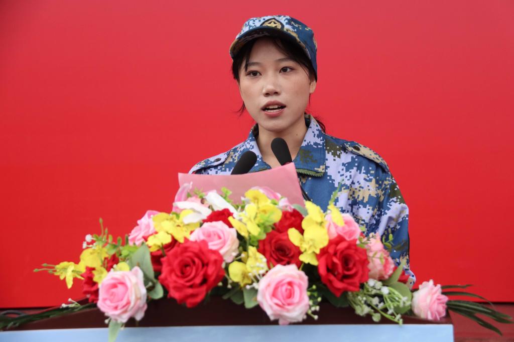 党委副书记王为一宣读表彰2023级本科学生军训先进集体和先进个人的决定;承训单位领导向“军训标兵”代表颁发证书;张彦铎向“优秀教官”代表颁发证书;吴超仲向军训承训单位赠送锦旗。承训单位领导,教师代表、资源环境与旅游学院教师龙雨萍,后勤服务人员代表、学生公寓物业管理员曾庆平,老生代表、体育教育专业2021级学生朱致远,研究生新生代表、学前教育专业学生高国艳、本科生新生代表、数学类专业学生阮书菲依次发言。