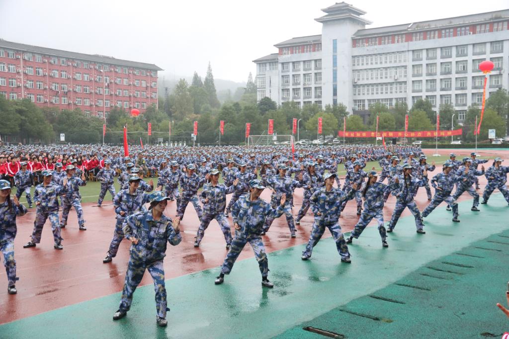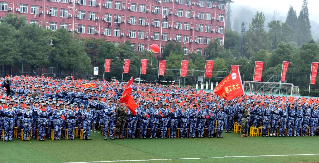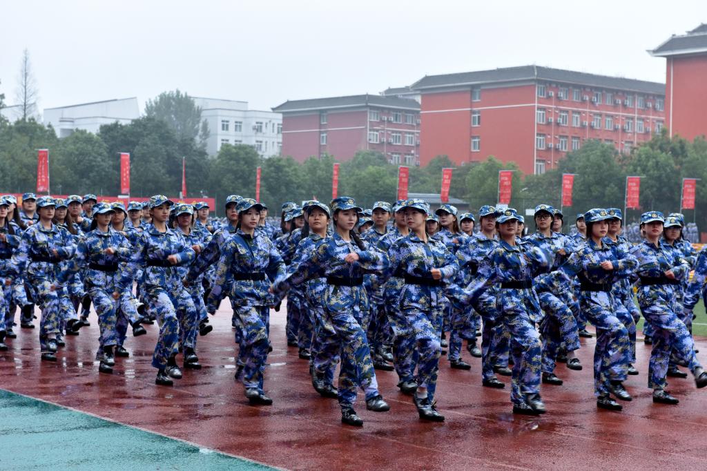 秋雨微凉。2023级新生排着整齐的队伍、喊着嘹亮的口号依次列队走过主席台,汇报他们的军训成果;擒敌拳方阵、刺杀操方阵一招一式铿锵有力、气势恢宏,赢得阵阵喝彩声。