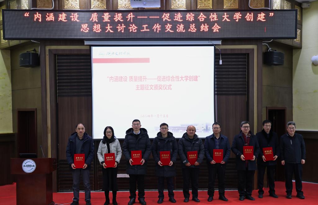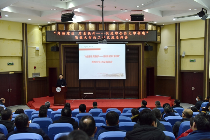 (发规处 通讯员 陈俊)1月15日下午,学校举行“内涵建设 质量提升——促进综合性大学创建”思想大讨论工作交流总结会,全面总结本次思想大讨论形成的成果。学校党委书记吴超仲出席会议并讲话,校领导张樊、汪云、曹健、张宇辉、毛春出席会议,会议由校长张彦铎主持。