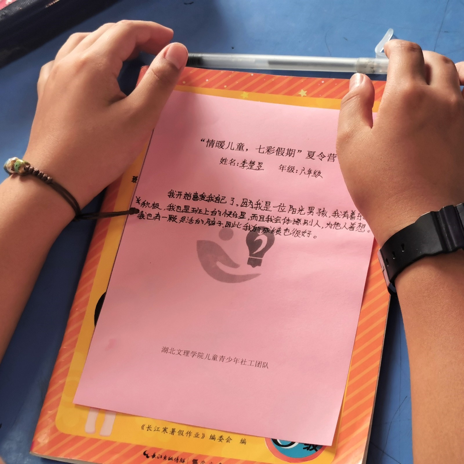 湖北文理学院儿童青少年社工团队,由3名团队指导老师与8名2019级社工专业大学生志愿者组成,团队坚守社会工作价值观与专业伦理,积极探索如何运用社会工作理论与方法帮扶乡村儿童成长。在夏令营开营当天,就给小学生们讲了“安全教育”,并让参加夏令营的学生家长签订了《安全承诺书》,让家长、孩子、志愿者共同保护孩子们的安全。