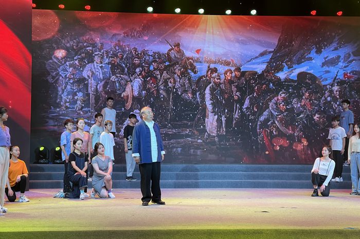 同学们和国家一级导演史德才老师一起排练大型音乐诗画《旗帜 序》