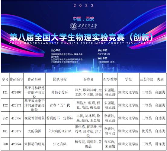 (物电学院 通讯员 杨正波)近日,2022年第八届全国大学生物理实验竞赛(创新)决赛在西安交通大学落幕,经过激烈角逐,我校选拔参赛的5个项目分获国家二等奖2项、三等奖2项、优秀奖1项。