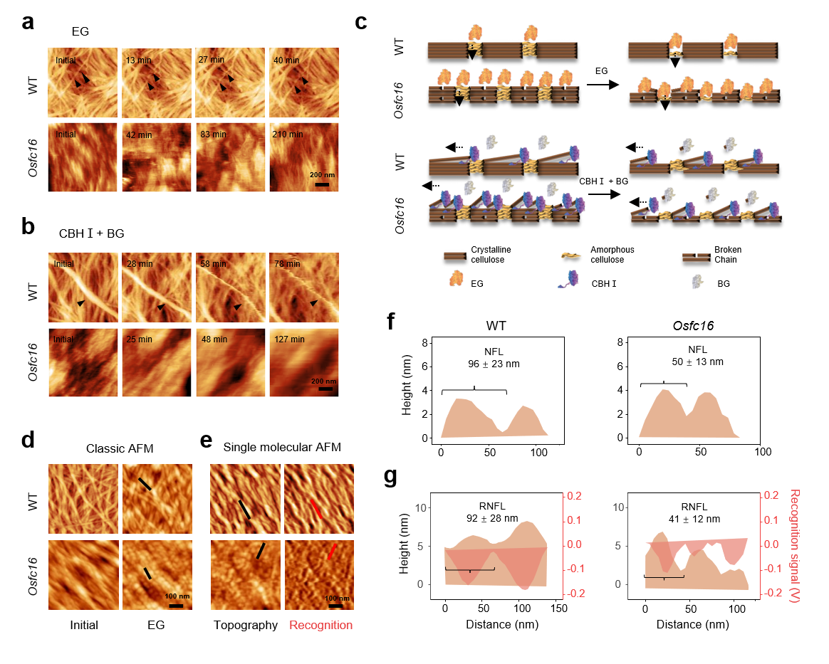 此次发表的成果延续了前期的研究,深入解析突变体osfc16的纤维素超微结构变异。该研究利用配备单分子识别系统的原子力显微镜技术,在突变体osfc16中发现了长度缩短的纳米纤维组装,直接产生了高密度无定形纤维素区域。通过使用单个类型的纤维素酶原位酶解,在突变体osfc16中观察到更加有效的酶催化模式。此外,在体外实验中还研究了突变体osfc16所产生的纤维素纳米纤维能够转化为尺寸缩小的纳米晶。据此,总结突变体osfc16中同时存在纵向尺度上的无定形纤维素区域和内部断裂的纤维素链,能够作为启动和完成纤维素水解成更高产量的可发酵糖的突破点。这项研究微观观察了植物纤维素底物的降解和转化过程,同时揭示了纤维素纳米改良的可能性。