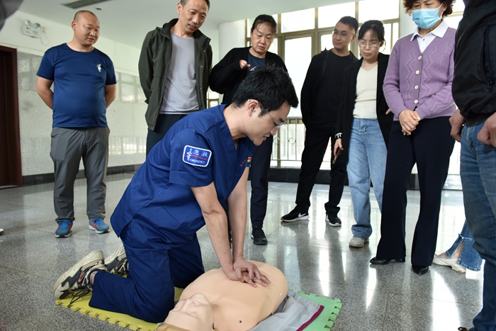 附属医院(市中心医院)急诊重症医学科副主任张露对现场实操进行指导。他强调,发生心搏骤停后的前4分钟是采取现场急救的黄金时间。希望大家在接受此次培训后,在遇到紧急情况时,勇于开展现场救治,尽最大努力挽回患者生命。