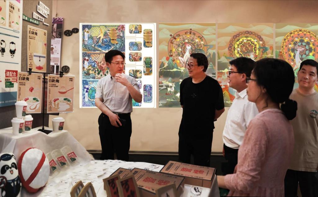 美术学院院长蔡伟向张彦铎介绍了毕业生结合社会需求进行选题的创作情况,毕业作品的应用价值、影响及作品的思想内涵、创意理念、制作过程。