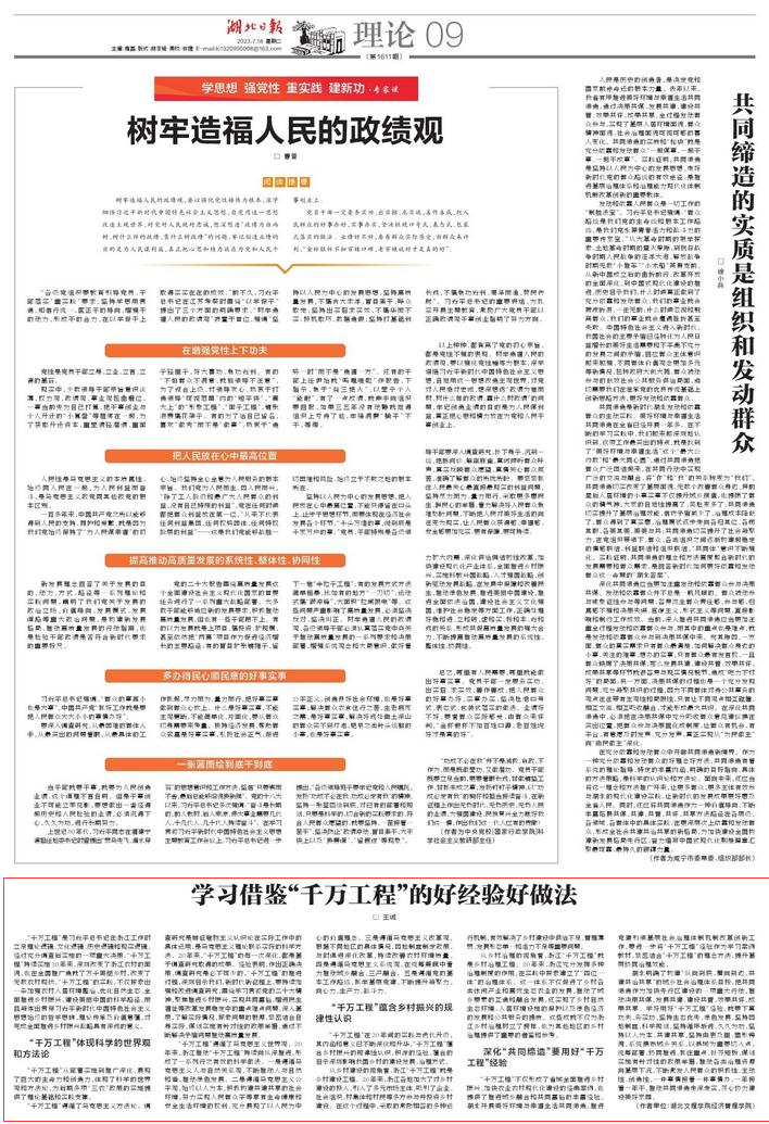 “千万工程”不仅形成了省域全面推进乡村振兴、加快农业农村现代化建设的经典案例,也提供了推进城乡融合和共同富裕的丰富经验。湖北开展美好环境与幸福生活共同缔造,推进党建引领基层社会治理体制机制改革创新工作,要进一步将“千万工程”经验作为学习案例教材,紧密结合“千万工程”的理念方法,提升基层协同治理效能。