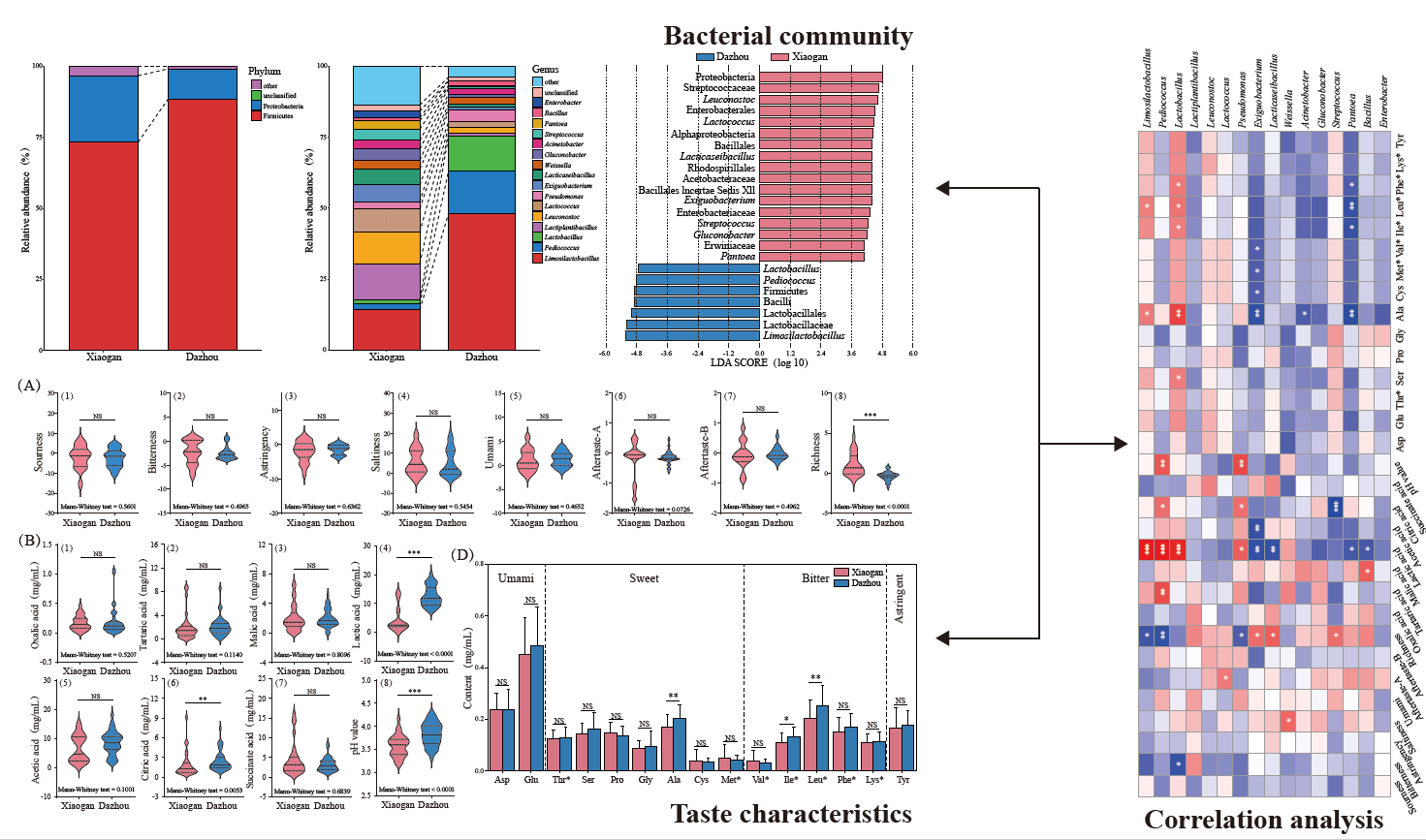 孝感米酒和东柳醪糟均为中国地理标识产品,受酿造环境、操作工艺和原料种类的影响,二者滋味品质各具特色。传统发酵食品团队从湖北省孝感市和四川省达州市大竹县分别各采集了30份和37份米酒样品,在使用第二代高通量测序技术对其细菌类群进行解析的同时,进一步采用人工智舌系统对二者滋味品质特征进行了数字化评价,同时使用高效液相色谱仪和氨基酸分析仪等现代食品检测设备对其呈味物质种类和含量进行了分析,进而实现了对孝感米酒细菌类群及其滋味品质形成机制的揭示。研究结果表明,孝感米酒蕴含了独特的细菌类群和丰富的乳酸菌资源,其中limosilactobacillus(发酵粘液乳杆菌属)、pediococcus(片球菌属)和lactobacillus(乳酸杆菌属)等乳酸菌类群对米酒滋味品质的形成具有积极作用。研究团队进一步采用传统纯培养结合分子生物学技术对米酒中蕴含的乳酸菌资源进行了挖掘、鉴定和保护,获得乳酸菌菌株145株,并全部存入发酵食品微生物菌株种质资源库进行保藏。在立足我省特色酿酒产业发展实际的基础上,本研究结果加深了科研和技术人员对孝感米酒酿酒功能微生物的认识,对强化孝感米酒农产品地理标志培育保护和提升其产品品质具有积极的意义。