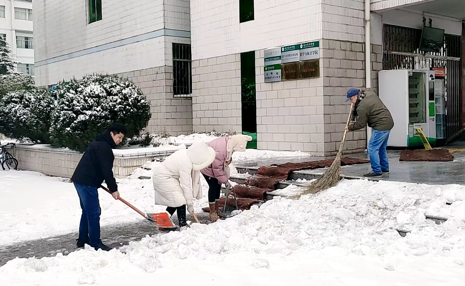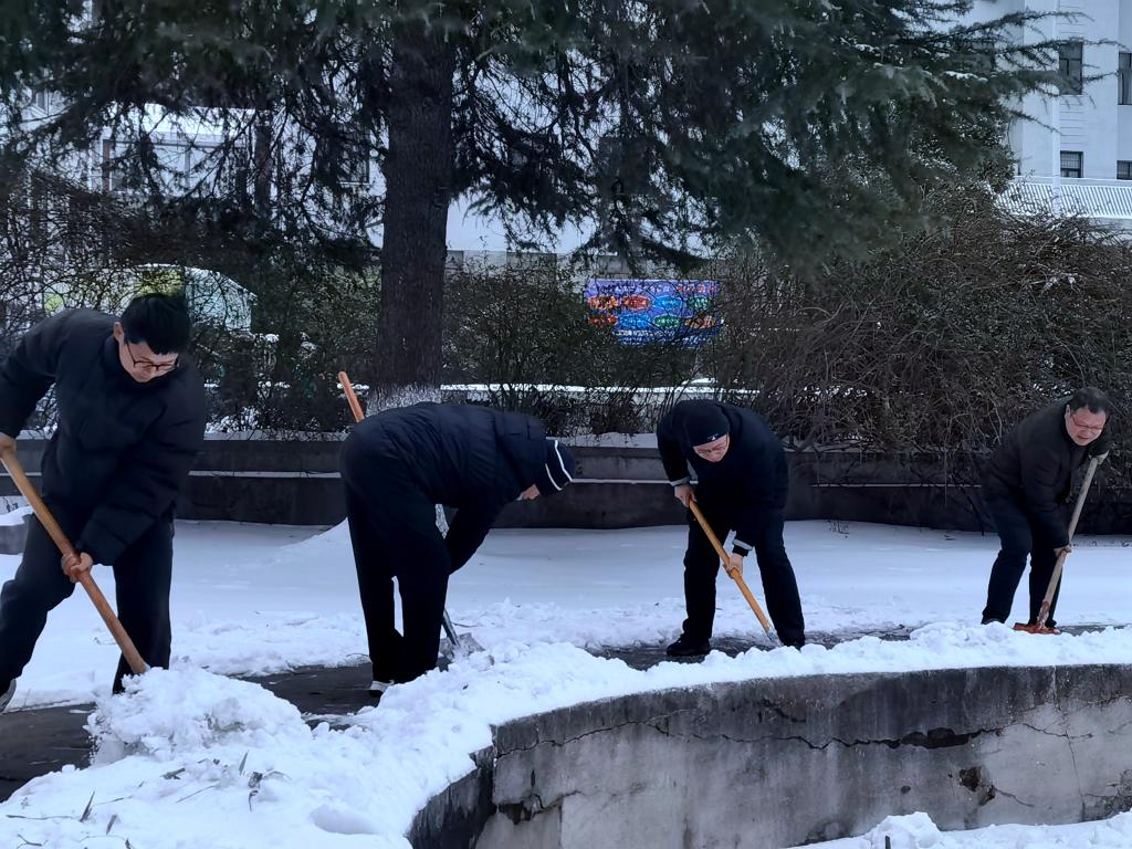 基础医学院教职工清理楼前以及通往医学楼主干道积雪