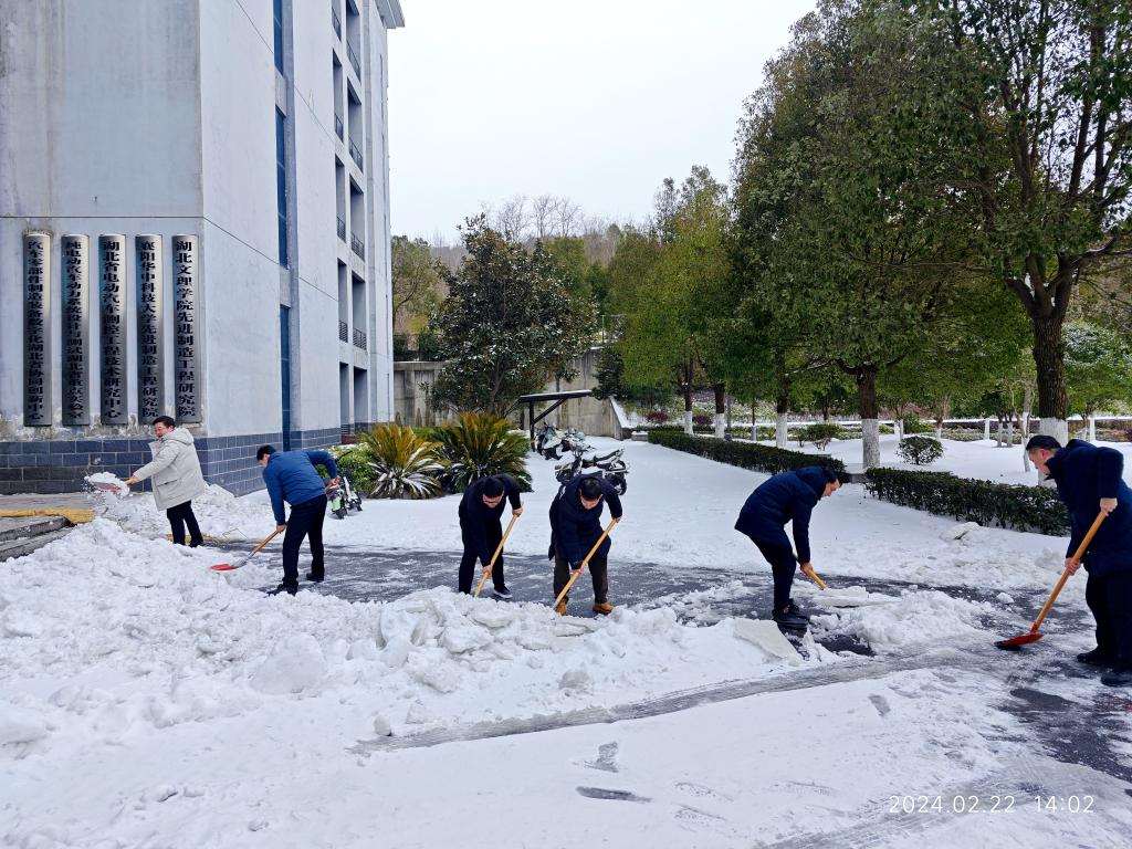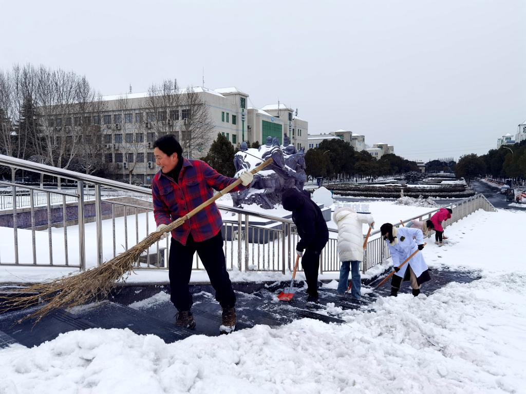 近日,低温暴雪突袭,校内结冰积雪严重,影响师生安全出行,为保证开学师生员工正常通行,学校党员干部积极参与扫雪除冰,齐心协力保畅通、保安全。