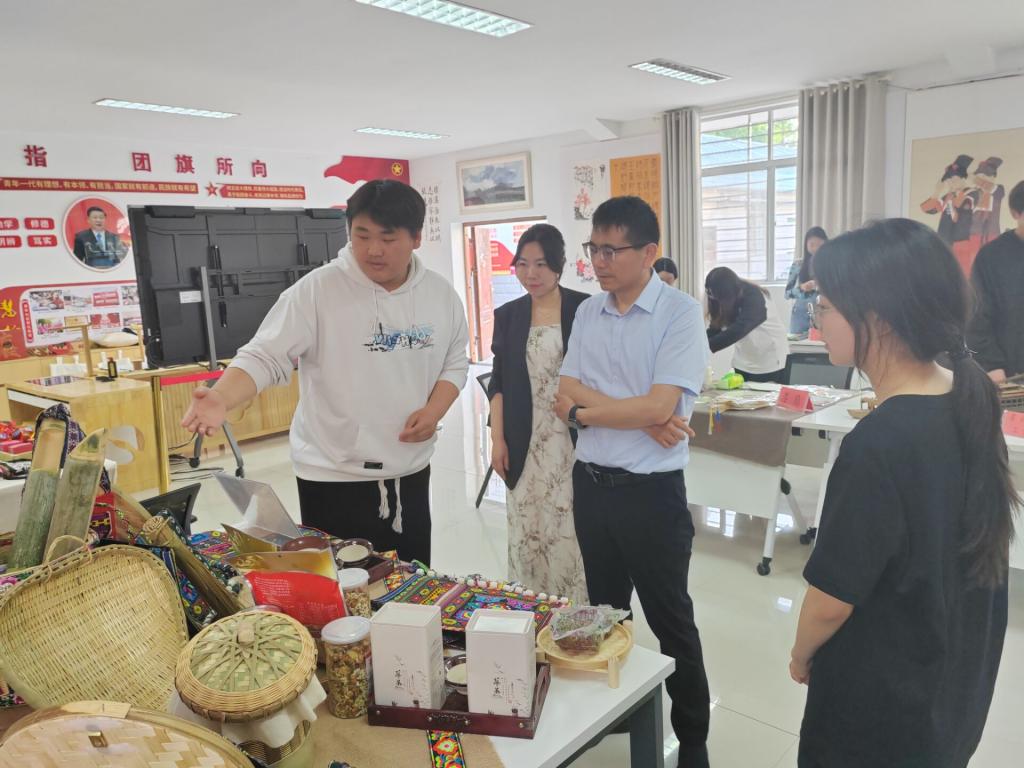 团委副书记龚丽丽从社团打卡区、民族风情微展区、非遗文化体验区、数字教学区四个方面介绍了“石榴籽”驿站的布展及建设理念与特色成果。吴超仲详细了解了手工制作、书法、民族服装等内容,对“襄船”木艺传承与创新艺术实践作品参展第七届全国大学生艺术展表示赞许。