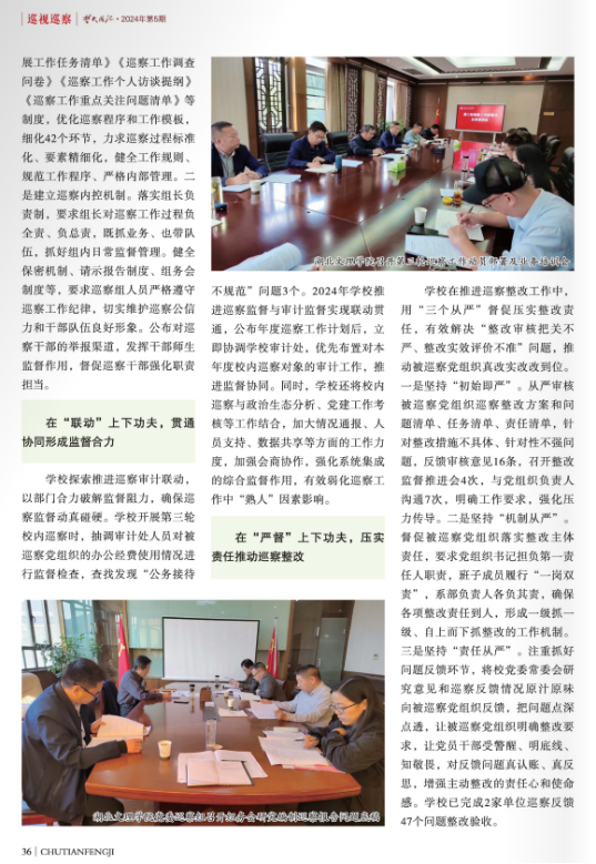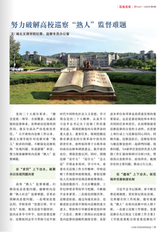 该文从“在‘求同’上下功夫,凝聚共识实现同题共答”“在‘遵规’上下功夫,规范程序完善制度机制”“在‘联动’上下功夫,贯通协同形成监督合力”“在‘严督’上下功夫,压实责任推动巡察整改”等四个方面,宣传推介了学校自2022年以来开展的三轮校内巡察的典型做法和工作经验。