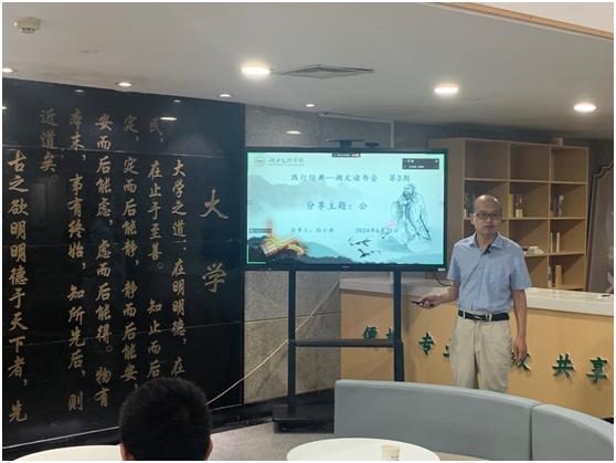 (襄阳历史文化研究院·汉江研究院 通讯员:王椰)6月13日下午,湖文读书会第三期在图书馆二楼德园举行,资源环境与旅游学院孙小舟教授围绕主题“公”作经典导读分享。学校党委书记吴超仲,党委副书记、副校长张樊参加读书会。读书会由襄阳历史文化研究院·汉江研究院王翔教授主持。
