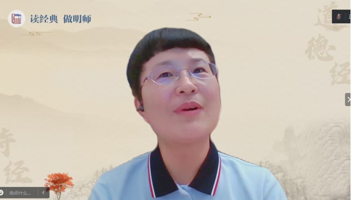 秦军荣在感悟经典的环节中分享了《道德经》中“静”的哲思,阐释了“静以修身、以静养德、宁静致远”的丰富内涵。她认为,“静以修身”则要以“静为躁君”的理念为指导,通过“静之徐清”的自我反省与“守静笃”的坚定信念,修身养性,培养稳重厚实、淡定从容的个人品质;“以静养德”则要在纷扰世事中保持淡泊名利的心态,学会谦下包容,以静谧之心滋养高尚品德;“宁静致远”则是一种无私奉献、守正创新的境界,倡导大家在宁静中寻求深远的发展,不断超越自我,向更高远的目标迈进。在践行经典的环节,秦军荣结合学校的校训“淡泊明志,宁静致远”,提出了“每日四静”的实践原则,即“静心、静读、静思、静行”,并以诗句“静以修身自从容,淡泊名利养玄德。最是无私能致远,守正创新向未来”总结了自己对“静”的理解与感悟。