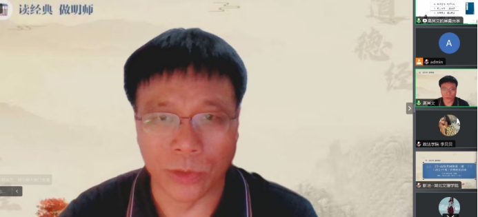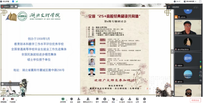 (襄阳历史文化研究院·汉江研究院 通讯员 王椰)2024年8月15日,由我校承办的全国“25 高校经典研读共同体”第6期专题研讨会在线上顺利召开。本次研讨会的主题为“《道德经》的学习感悟与践行思考”,学校研究生院副院长高其文、文学与传媒学院教授高新伟、美术学院党委副书记胡敏、党政办主任秦军荣四位老师分别围绕《道德经》中的道、慎、水、静四个主题进行导读分享,来自全国的500余位师生参加活动。研讨会由学校党委书记吴超仲主持。