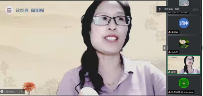 胡敏在感悟经典环节引用《道德经》第八章的“上善若水,水善利万物而不争”,引导大家以“水”为镜,映照高尚人格。她认为“水”身处低洼不与万物争强斗胜的特性,彰显了无私奉献、淡泊名利的特质。胡敏引用《道德经》第十五章,言及“古之善为道者,混兮其若浊,澹兮其若海”,将有道之士的胸怀比作浩瀚无垠的大海,能够包容万物,纳百川而自净,展现了圣人无私无欲、广纳博爱的崇高品质;引用《道德经》第三十二章中“譬道之在天下,犹川谷之于江海”,阐释了自然法则与社会治理之间的深刻联系,倡导在追求社会进步的过程中,不忘初心,坚守大道,行稳致远;引用《道德经》第八章中“水”的七善——“居善地、心善渊、与善仁、言善信、政善治、事善能、动善时”,倡导大家学习无私包容、谦和友善的品性。在践行经典环节,胡敏分享了“共和国勋章”获得者张富清与“七一勋章”获得者张桂梅的事迹,强调新时代的楷模们以无私贡献与深切关怀,诠释了水一般滋养万物的奉献精神,呼吁大家学习这种精神,共同推动社会进步。