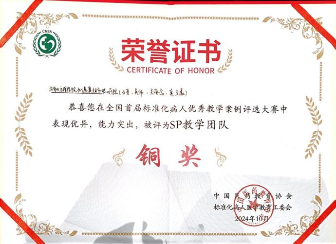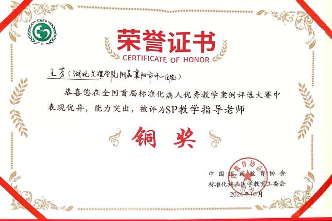 (医学部 通讯员 崔露)10月20日,在浙江杭州举办的全国首届标准化病人(sp)优秀教学案例评选大赛中,由学校附属襄阳市中心医院报送,临床医学院常务副院长、附属襄阳市中心医院副院长曹锋生,医教协同处处长、临床医学院副院长关思虞,襄阳市中心医院督导毛春指导,临床技能培训中心副主任王芳,急诊重症科关伟,吴海念、龚文豪演绎的教案《胸痛中心不稳定型心绞痛的病情及治疗方案告知》,在综合组参赛作品中脱颖而出,荣获“sp教学团队”铜奖,王芳荣获“sp教学指导老师”铜奖,吴海念、龚文豪荣获“sp标准化病人”铜奖。