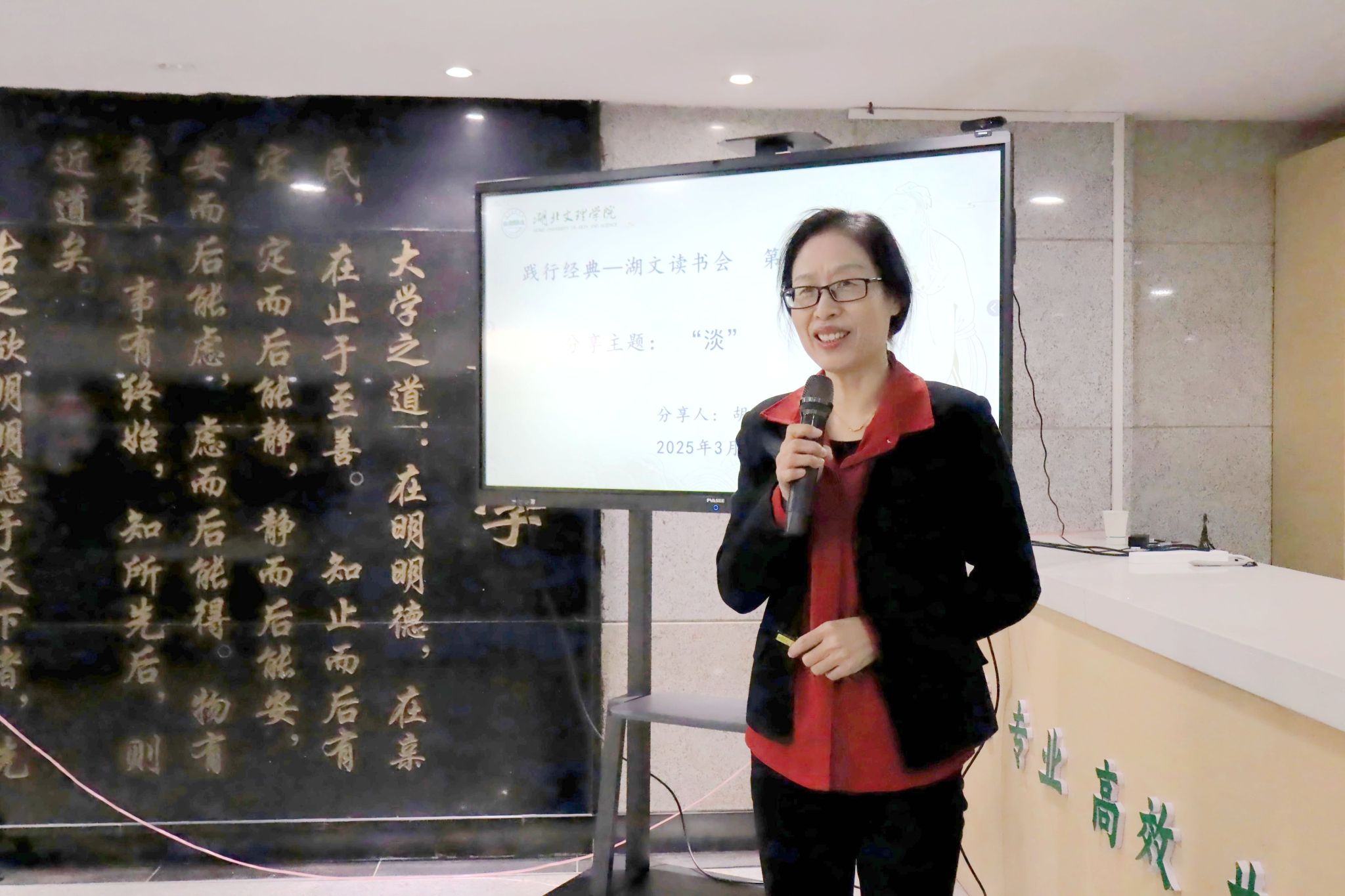 (襄阳历史文化研究院•汉江研究院 通讯员 熊文斌)3月27日下午,湖文读书会第二十九期在图书馆二楼德园举行,学校美术学院党委副书记胡敏以“淡”为主题作经典导读分享。学校党委副书记、副校长张樊参加读书会。读书会由襄阳历史文化研究院•汉江研究院高慧霞博士主持。