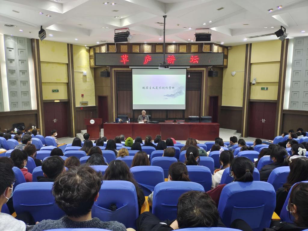 (美术学院  通讯员  杨紫秋 )“不管变幻如何,艺术的真诚和良知决不可丢失。追求艺术的真、善、美,注重人格的完善,永远是我们前行的精神标杆。”10月19日晚,美术学院在学校行政楼一楼报告厅举办草庐讲坛,湖北省美术家协会副主席刘仲杰作题为《现实主义美术创作赏析》专题讲座。美术学院180余名师生代表聆听讲座。
