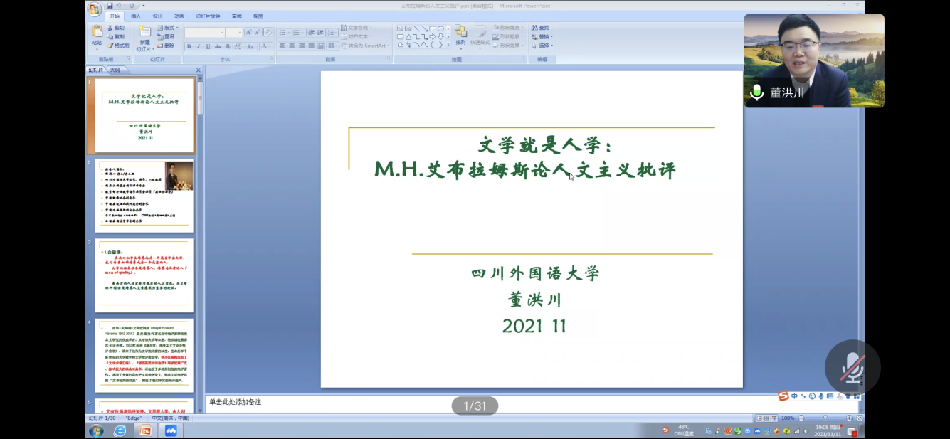 (外国语学院 通讯员 马鹏飞)11月11日晚,四川外国语大学校长、博士生导师董洪川教授应邀做客隆中讲坛(线上),为学校师生作题为《文学就是人学:m.h.艾布拉姆斯论人文主义批评》的学术讲座。纪委书记、监察专员宋双伟出席活动并致辞,希望学院师生认真学、深刻悟、勤奋行、求进步。讲座由外国语学院副院长王林主持。