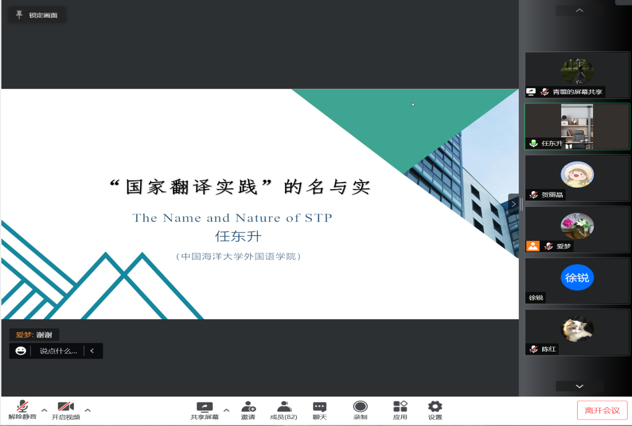 (外国语学院 通讯员 贺丽晶)3月28日晚,中国海洋大学外国语学院教授、博士生导师任东升应邀做客隆中讲坛,为外国语学院师生作题为《国家翻译实践的名与实》的线上学术讲座。讲座由外国语学院副院长王林主持,近百名师生聆听了讲座。
