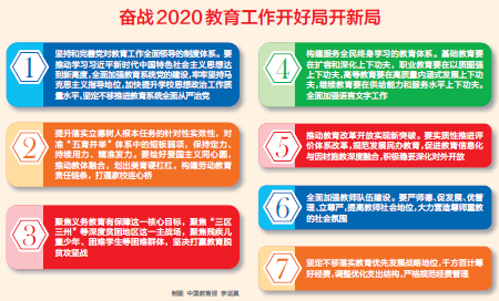 会议强调,2020年是一个具有标志性、转折性意义的年份,十分关键特殊。教育系统必须牢牢树立起“收官”的强烈意识,在此基础上开好局、开新局。一是坚持和完善党对教育工作全面领导的制度体系。要推动学习习近平新时代中国特色社会主义思想达到新高度,全面加强教育系统党的建设,牢牢坚持马克思主义指导地位,加快提升学校思想政治工作质量水平,坚定不移推进教育系统全面从严治党。二是提升落实立德树人根本任务的针对性实效性,对准“五育并举”体系中的短板弱项,保持定力、持续用力、精准发力。要绘好爱国主义同心圆,推动教体融合,划出美育硬杠杠,构建劳动教育责任链条,打通家校连心桥。三是聚焦义务教育有保障这一核心目标,聚焦“三区三州”等深度贫困地区这一主战场,聚焦残疾儿童少年、困难学生等困难群体,坚决打赢教育脱贫攻坚战。四是构建服务全民终身学习的教育体系。基础教育要在扩容和深化上下功夫,职业教育要在以质图强上下功夫,高等教育要在高质量内涵式发展上下功夫,继续教育要在供给能力和服务水平上下功夫。全面加强语言文字工作。五是推动教育改革开放实现新突破。要实质性推进评价体系改革,规范发展民办教育,促进教育信息化与因材施教深度融合,积极稳妥深化对外开放。六是全面加强教师队伍建设。要严师德、促发展、优管理、立尊严,提高教师社会地位,大力营造尊师重教的社会氛围。七是坚定不移落实教育优先发展战略地位,千方百计筹好经费,调整优化支出结构,严格规范经费管理。