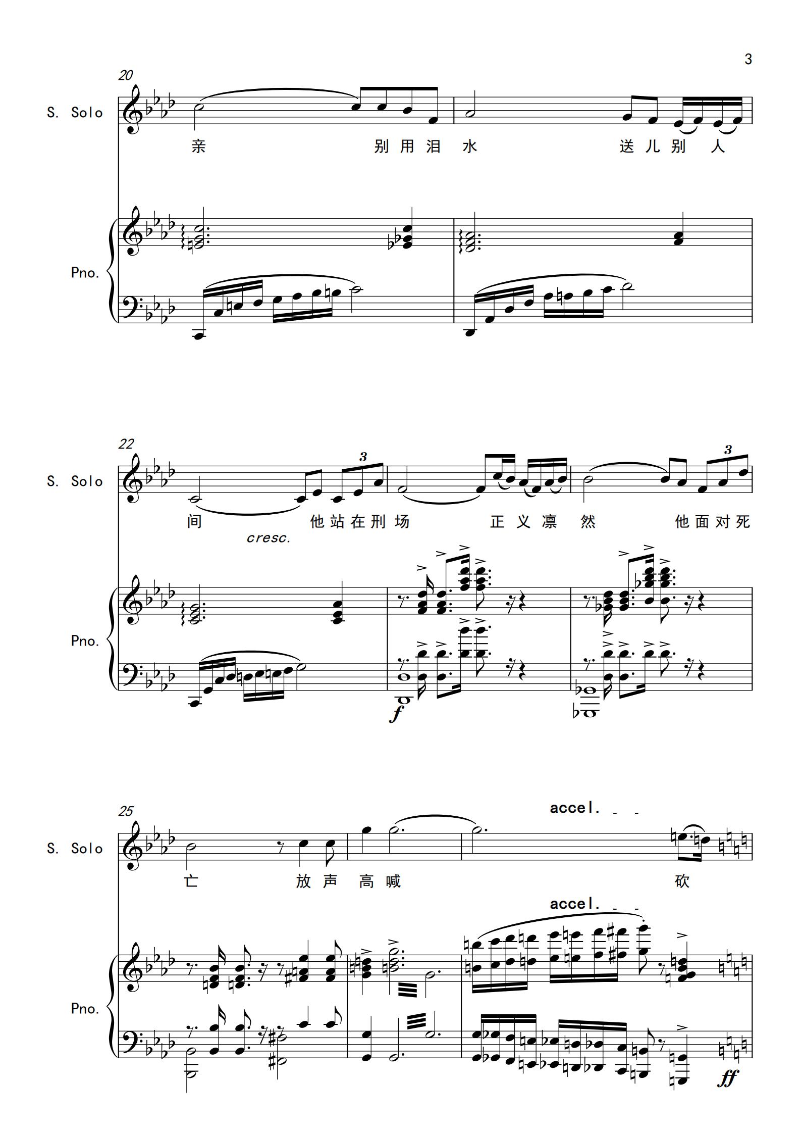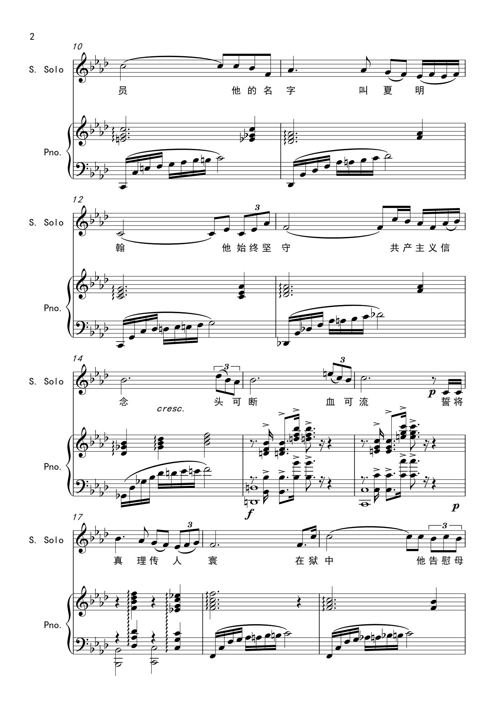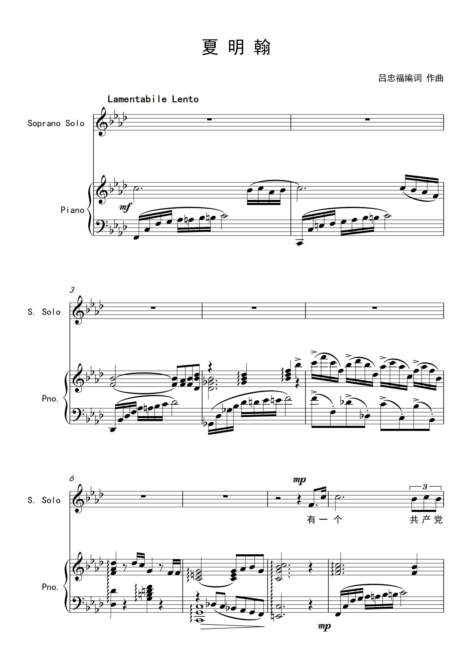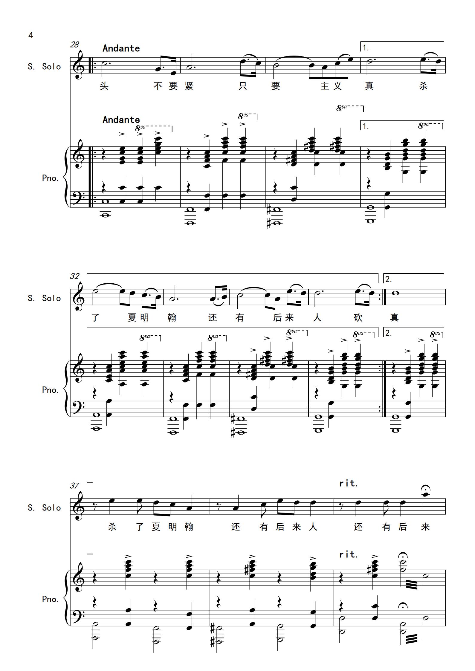 作品以共产党员夏明翰烈士的《就义诗》为中心并适当展开和深入,复三部曲式。前奏(f小调)主要运用民族调式,调性游离不定,结合西洋作曲技法,表现哀伤的诉说和回忆;a段采用叙述式,表现了烈士牺牲时的场景,悲壮和激昂;中段(c大调)适当应用了《国际歌》音调,再现英雄的呐喊和期盼;间奏通过二级转调回归a段主题;再现段及尾声描写英雄感人事迹、对“后来人”的激励及革命胜利后对英雄的告慰之情。