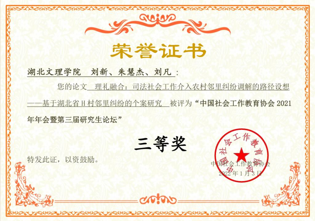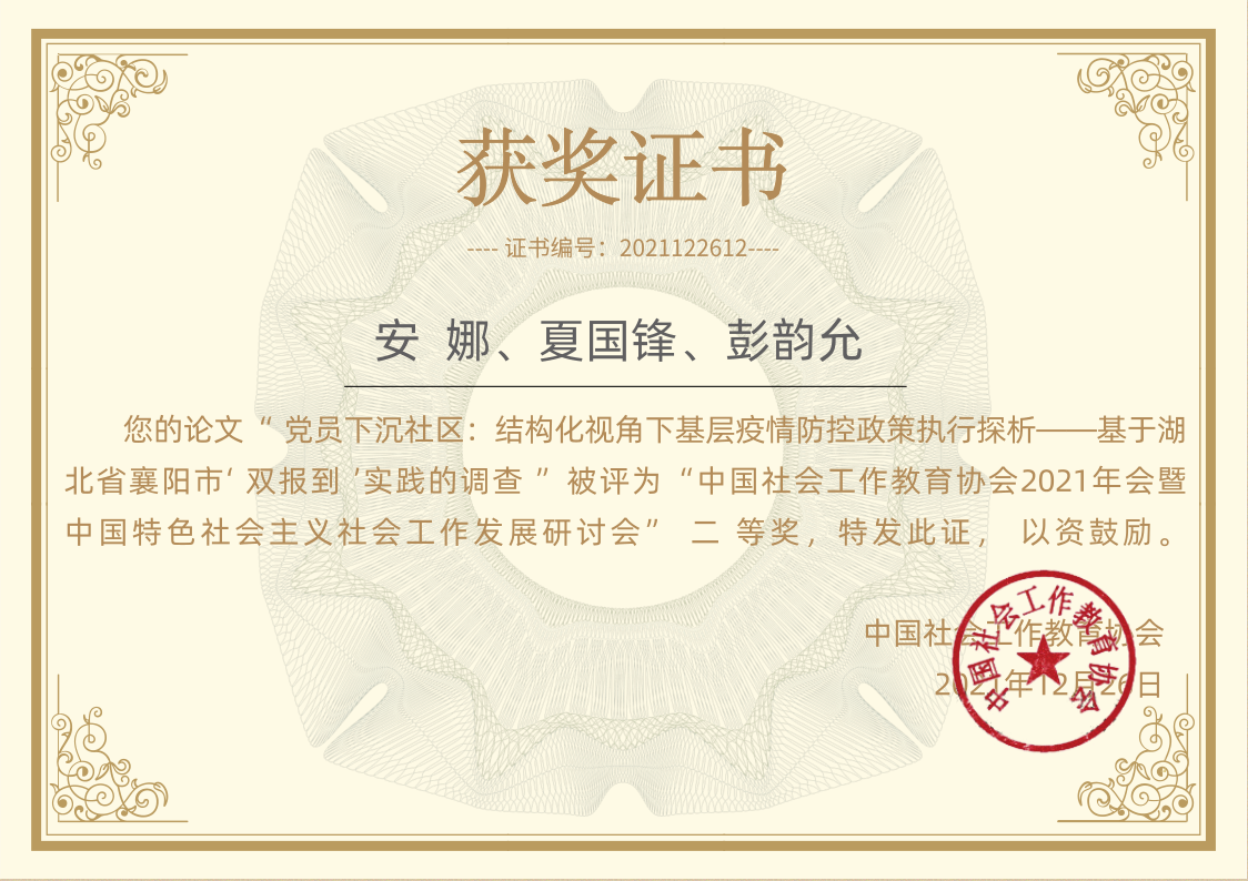 (政法学院  通讯员  彭韵允) 在近日线上召开的中国社会工作教育协会2021年会暨中国特色社会主义社会工作发展研讨会上,我校政法学院社会工作专业研究生安娜、彭韵允合作撰写的《党员下沉社区:结构化视角下基层疫情防控政策执行探析》(指导老师:夏国锋)获评年会论文二等奖;刘新、朱慧杰、刘凡合作撰写的《理礼融合:司法社会工作介入农村邻里纠纷调解的路径设想》(指导老师:何晓红)获评年会论文三等奖。