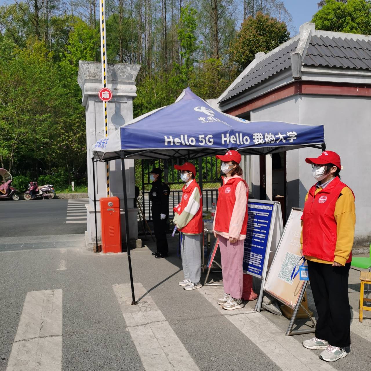 (外国语学院 通讯员 呙小云 李小俞 詹玉月 宋之允)4月3日,清明节假期第一天。校园里,从南门到西一门,直到学校大门,沿路各大门、路口都有志愿者站岗执勤。这些志愿者,都是外国语学院致远服务队的成员。假期三天,外国语学院组织开展校园疫情防控文明执勤志愿服务活动,协助保卫处工作人员,做好人员出入扫码验码、提醒行人佩戴口罩等,外院有80多名同学踊跃报名参加。活动得到保卫处和学工处的大力支持,他们指定专人与外院对接,为志愿者准备执勤物资。