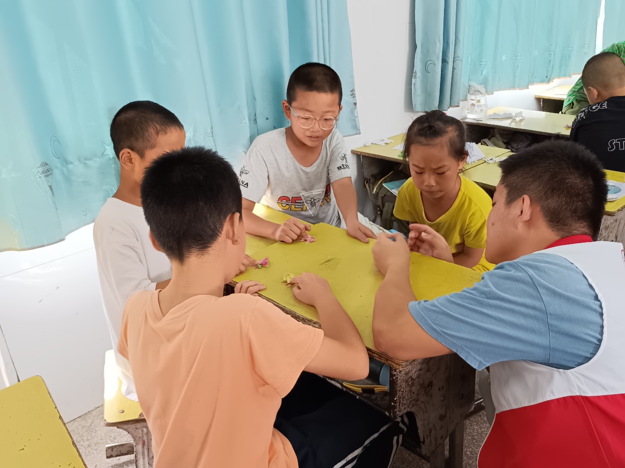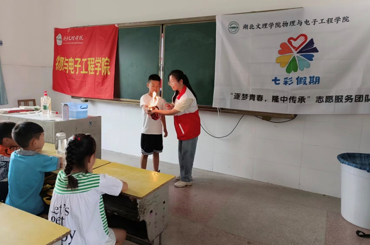 (物电学院 通讯员 黄晨 薛羿然)7月4日,物理与电子工程学院“逐梦青春,隆重传承”志愿服务团队,赴襄阳老河口市张集小学开展为期10天的“七彩假期”志愿服务活动,队员们围绕思想引领、科普实验、课业辅导、手工制作、体育运动五个方面开展。志愿者们利用多种教学方式,邀请学生参与课堂互动,亲自动手感受。