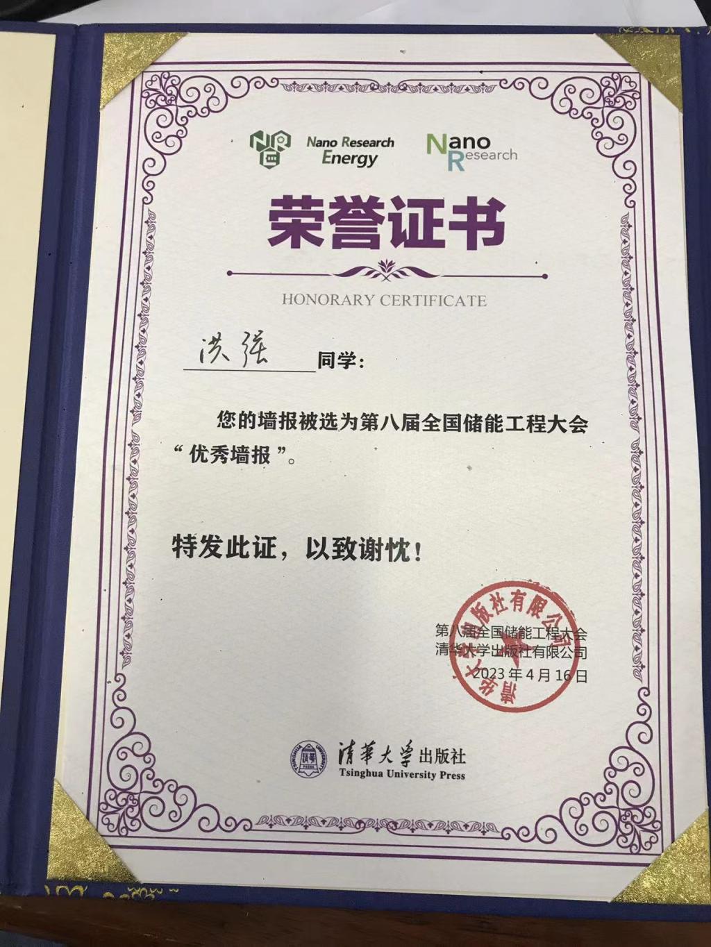 会上,李正同学作题为《压缩储能用涡旋空压机泄漏特性研究》的学术汇报,详细阐述了利用数值模型求解方法降低压缩储能用涡旋空压机泄漏的具体措施。洪强同学以《基于cso-aukf的锂电池soc估算》为题作汇报,提出了一种cso-aukf的锂电池soc估算方法来提高电动汽车动力电池剩余容量的估算精度。同时,洪强同学提交的《基于cso-aukf的锂电池soc估算》墙报,经专家评比,荣获第八届全国储能工程大会“优秀墙报”。