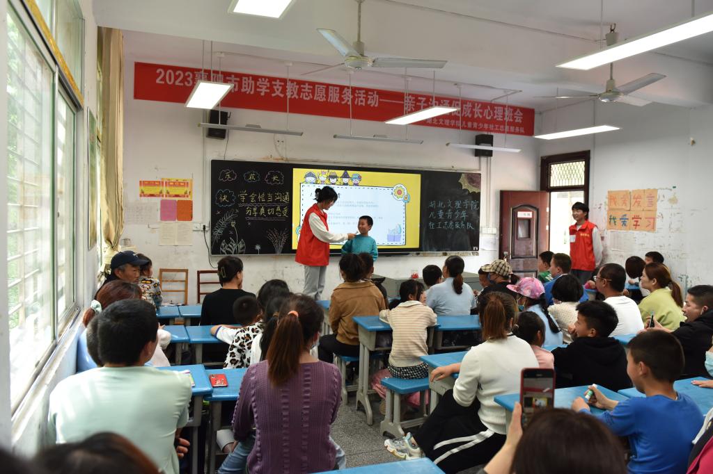 (政法学院 通讯员 邱福元 孙聪聪)为进一步弘扬志愿服务精神和社会工作助人自助的理念,促进亲子沟通,增进家庭幸福。4月27日下午,湖北文理学院儿童青少年社工志愿服务队在指导老师罗学莉教授带领下前往湖北文理学院附属中学小学部开展了2023襄阳市助学支教志愿服务活动“亲子沟通促成长”主题心理班会活动。