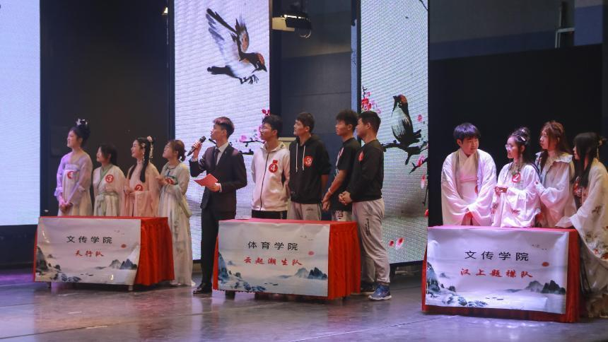比赛中,来自四个二级学院的六支队伍二十四名选手展开了激烈对决。个人必答题十分具有挑战性,但是各位选手还是迎难而上,诗采飞扬。抢答题和飞花令是本场比赛中最刺激的环节,各位选手大展身手,各显神通。这是知识储备的比拼,更是一场速度的对决。一句接一句,你来我往,紧追不舍。台上选手选手答得紧张激烈,台下观众看得酣畅淋漓。比赛间隙的《诫子书》朗诵与歌曲《兰亭序》,为紧张的比赛缓和了氛围。