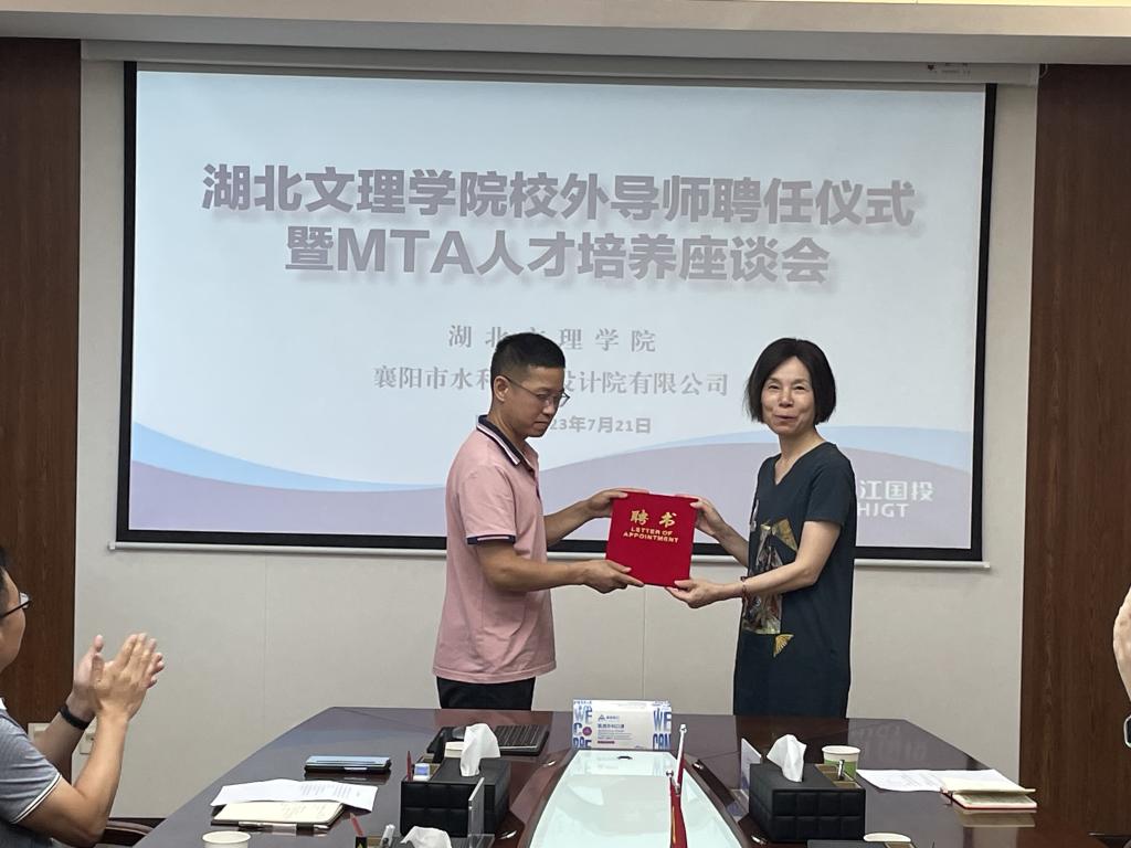 梁英介绍了学校研究生教育的历史和现状,并就教育部对专硕人才培养的要求、校外导师对人才培养的重要性以及今后拟开展的校企(地)联合培养活动进行了介绍。并代表学校为襄阳市规划展览馆馆长李戎、襄阳市水利规划设计院有限公司总经理张登红等两位mta校外导师颁发了聘任证书。