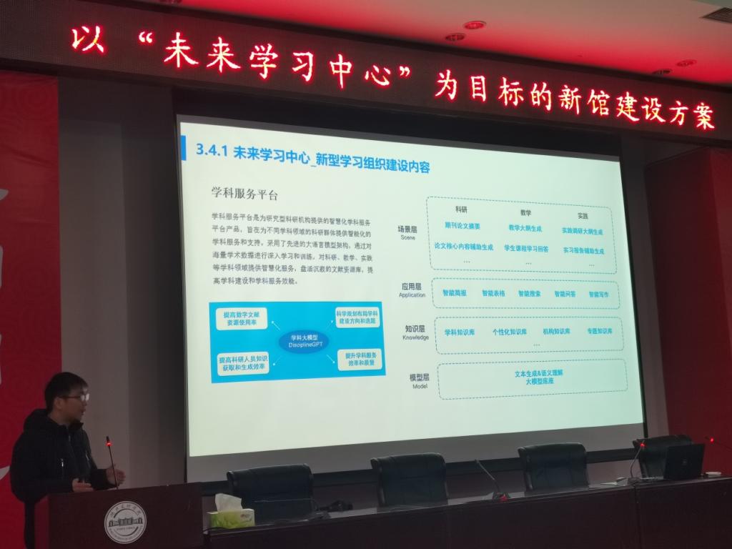 会上,武汉海昌信息技术有限公司工程师余泽亚作出以“未来学习中心”为目标的新馆建设方案主题分享。他通过武汉科技大学、湖北经济学院等高校图书馆建设案例,分别对“未来学习中心”建设背景、建设目标、建设内容作了阐述;并结合我校新区图书馆实际情况,从设计理念、整体架构、智慧学习空间规划和建设内容等方面,详细解读了以“未来学习中心”为目标的新馆建设构想。