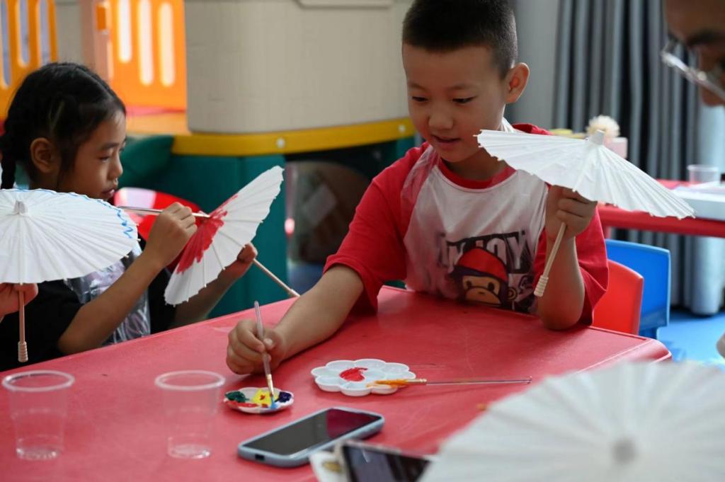 “小朋友们知不知道油纸伞的制作过程呀?”“我知道,我知道!要先砍竹子,再编架子……”志愿者李林烨带领孩子们了解油纸伞的制作过程,用实物向孩子们展示油纸伞的结构。志愿者为每个孩子准备了制作油纸伞的材料,孩子们在伞面上画下自己喜欢的图案,制作属于自己的油纸伞。二年级学生刘一诺激动地说:“原来非遗这么有意思呀!我原来一直以为非遗作品是大人才可以做的”。