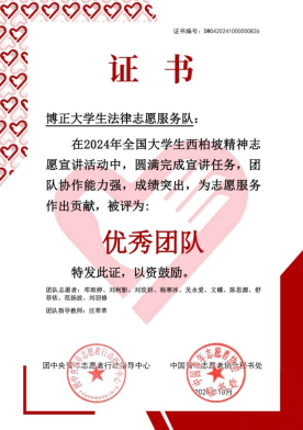 (政法学院  通讯员  邓雨婷)10月11日,团中央青年志愿者行动指导中心、中国青年志愿者协会秘书处发布通知,政法学院博正大学生法律志愿服务队在2024年全国大学生西柏坡精神志愿宣讲活动中,以扎实的理论知识,深入浅出的讲解方式,圆满完成了各项宣讲任务,获得了“优秀团队”荣誉称号。