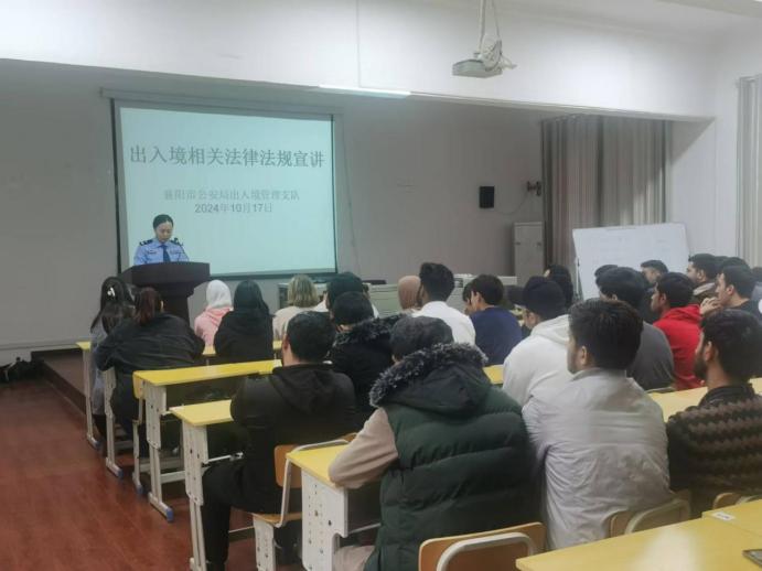 (国际处 通讯员 肖雅歆)10月17日下午,国际教育学院组织2024级来华留学生开展入学教育暨法律法规宣讲会。国际教育学院院长胡若飞、襄阳市公安局出入境管理支队副支队长邓昊、民警张竞婷,国际教育学院相关老师参加活动。