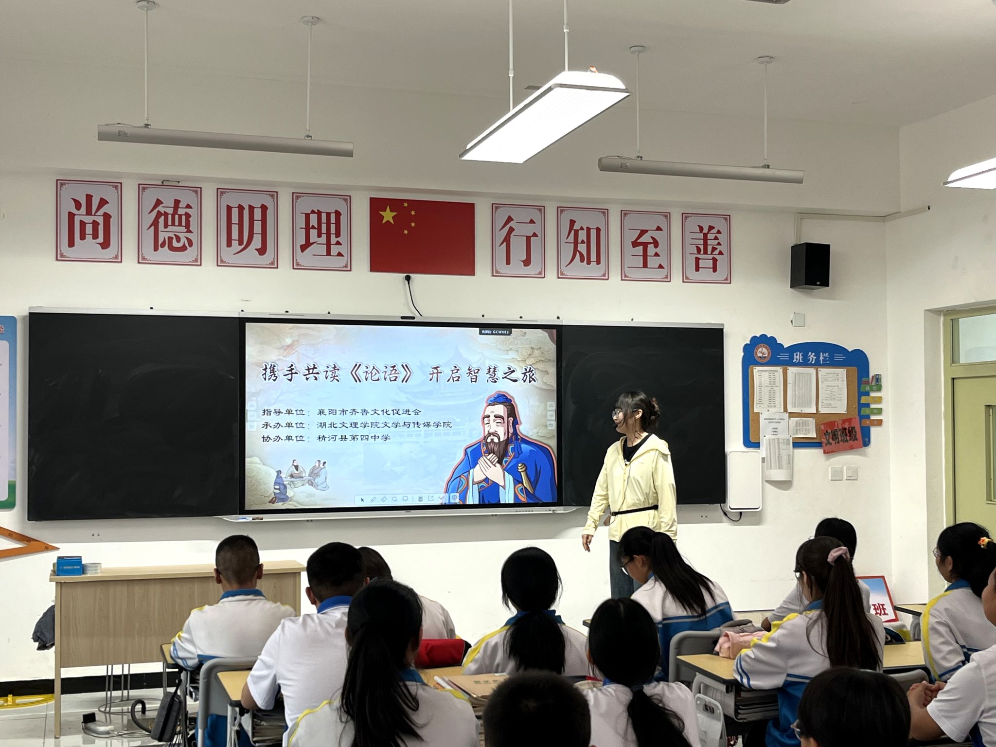 活动现场,雪莲花支教团成员、文传学院学科教学(语文)硕士研究生王艳玲以“学而时习之”开篇,运用“诵、解、悟、行”四步教学法,带领学生们沉浸体验《论语》的经典魅力。师生们齐声诵读“三人行,必有我师焉”,分组讨论“温故而知新”的现实意义,教室内书香氤氲。
