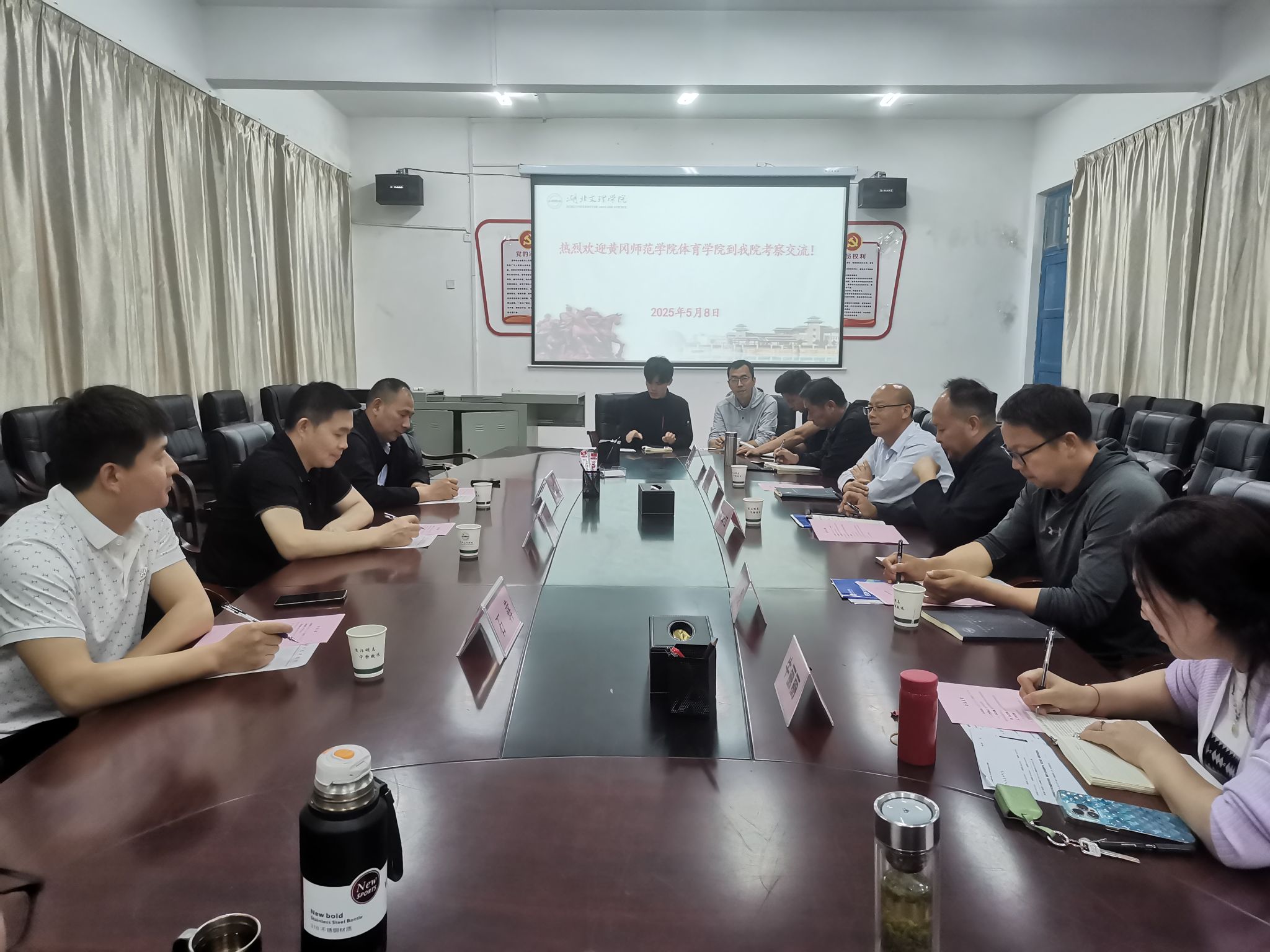 (体育学院 通讯员 詹中新)5月8日,黄冈师范学院体育学院院长徐金陆一行到学校体育学院考察交流,体育学院党委书记罗华国、院长张华江及各系部主任参加座谈。张华江主持座谈会。