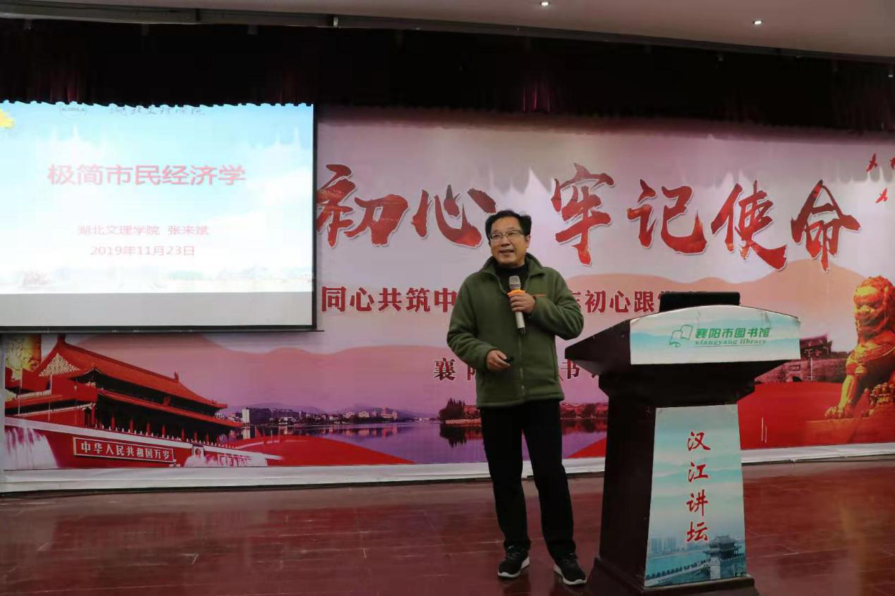 11月23日上午,襄阳市“汉江讲坛”特邀我校经济管理学院张来斌教授为来自本市不同行业的观众讲授“极简市民经济学”。