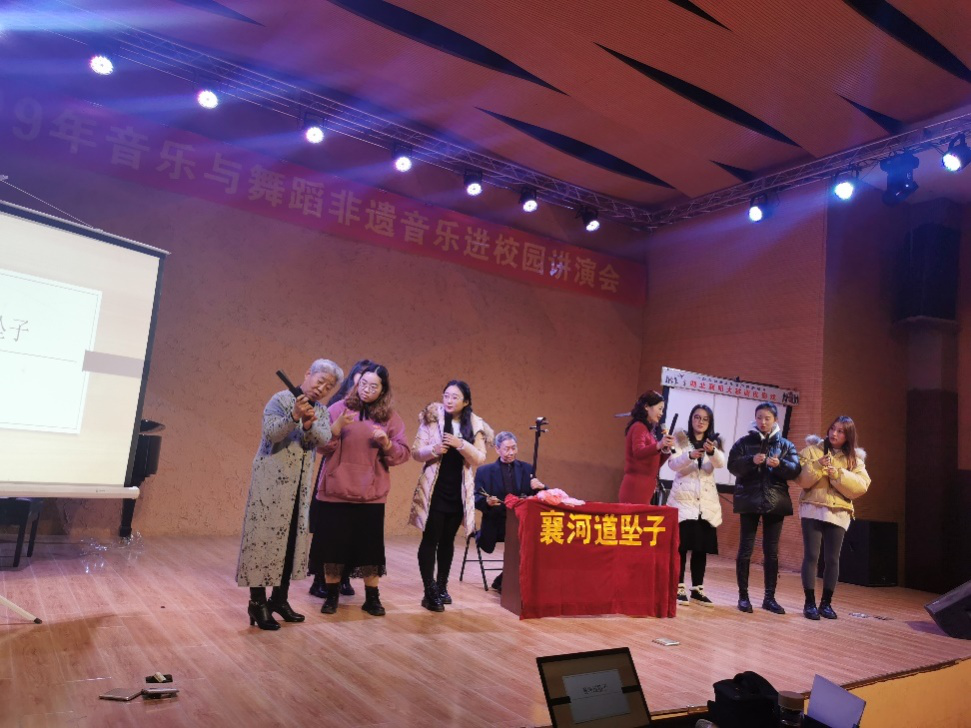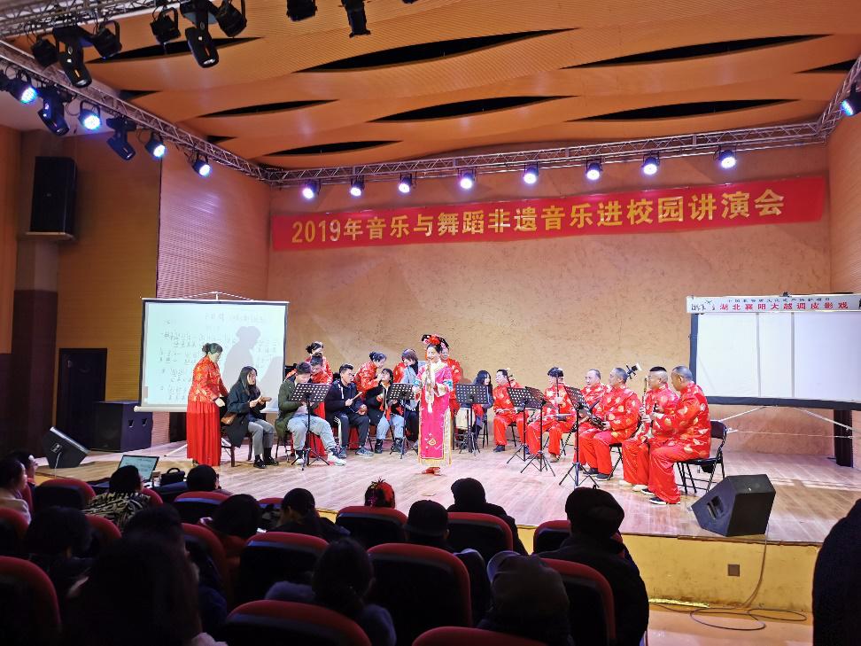 (音乐与舞蹈学院 通讯员 刘文静 谢秀敏)大越调皮影戏(市级非遗)、十样锦(市级非遗)、襄河道坠子(省级非遗),这些省市级非遗音乐被请进湖文校园。12月19日下午,2019年音乐与舞蹈学院非遗音乐进校园讲演会在南区s3栋音乐厅举行,科技处处长吴钊、副处长秦军荣,音乐与舞蹈学院全体教职工和部分学生参加活动。