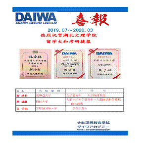 (外国语学院 通讯员 李小俞)3月12日,外国语学院收到来自日本大和语言教育学院发来的喜报,我校日语专业的3名学生被日本知名大学录取为硕士研究生。