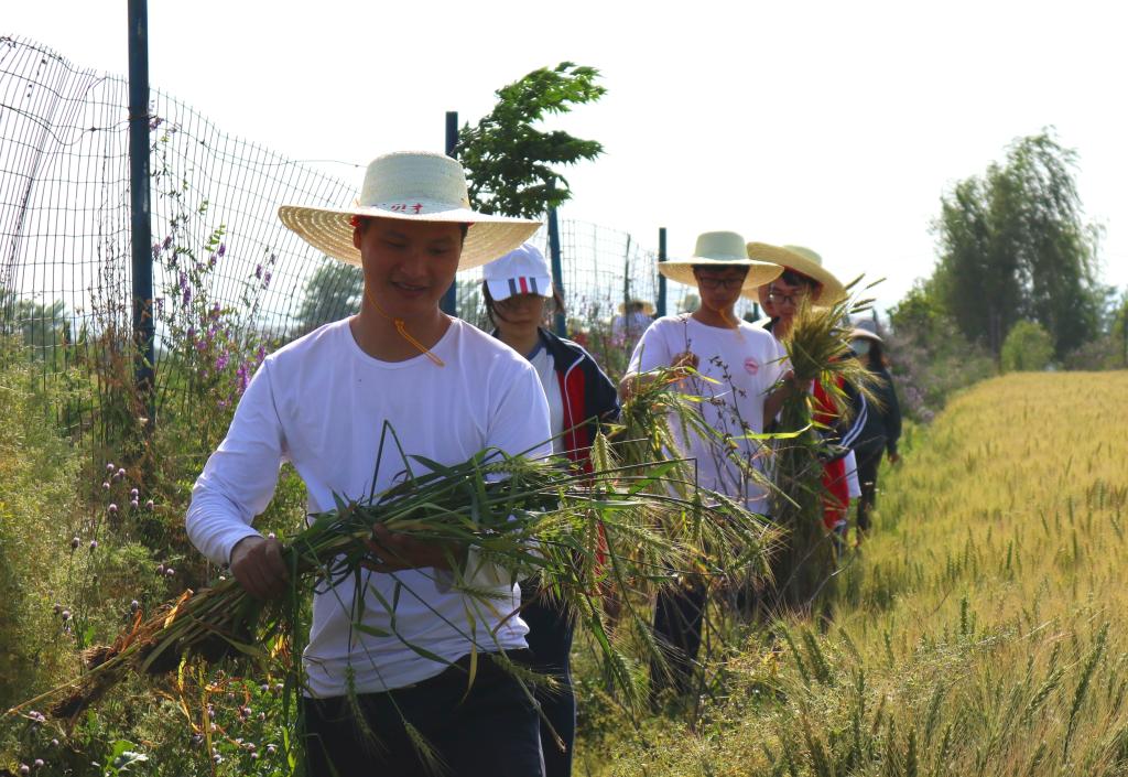 在小麦繁育基地,公司生产部负责人陆德海向师生们讲解了去除小麦田间杂株的技术要领,学生们顶着烈日、纷纷下田完成劳动实践,通过劳动增长知识、磨练意志。