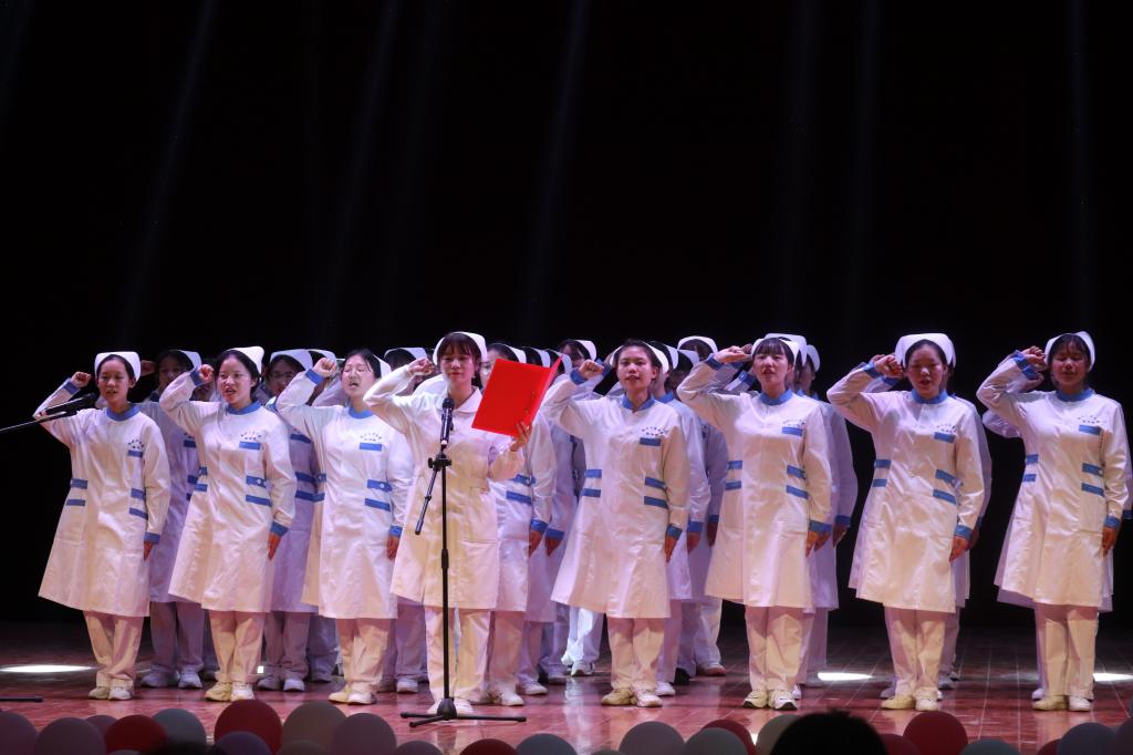 护理2011班全班同学庄严宣誓,“奉献、热爱、责任”,嘹亮的宣誓声感染着全场观众,表达了对护士职业最崇高的敬意和向往。