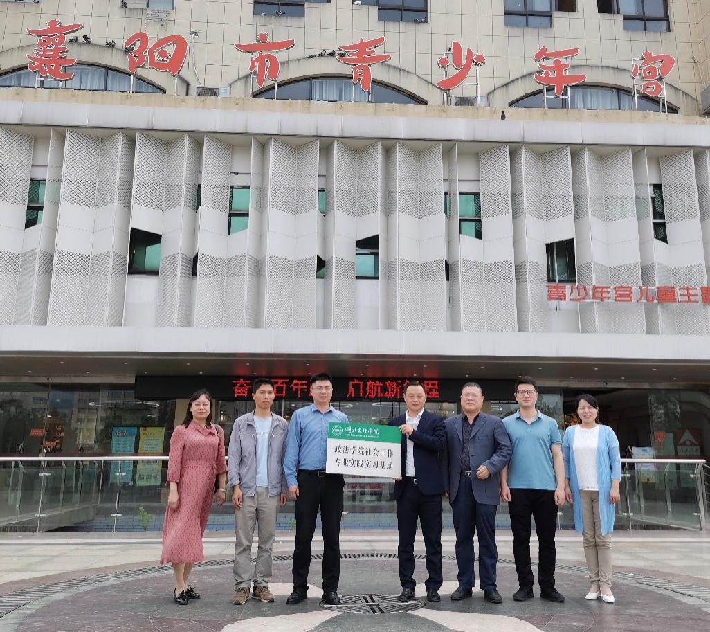 (政法学院  通讯员  罗学莉)5月11日下午,我校政法学院与共青团襄阳市委在市青少年活动中心,举行社会工作专业实习实践基地签约和揭牌仪式。共青团襄阳市委副书记丁超、学少权益部负责人周健,市青少年活动中心副主任王向前、邵玉,政法学院副院长夏国锋、王正宇,社会学系教授何晓红、副教授罗学莉参加活动。