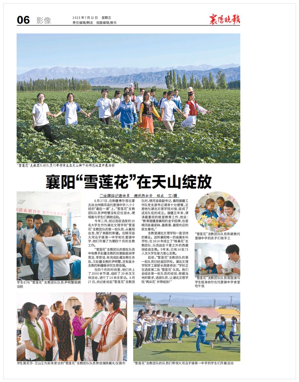 在四个月的时间里,他们共上了2000余节课,组织了20余次文体活动,进行了10余次家访。6月27日,向记者说起“雪莲花”支教团队时,精河县委副书记、襄阳援疆工作队党支部书记谭涛十分感慨,正是他与湖北文理学院对接,促成了这支队伍的成立。援疆三年来,谭涛最重视的就是教育工作,他说:“教育援疆是襄阳的金字招牌,也是精河县最紧缺、最需要、最受欢迎的民生事项。”