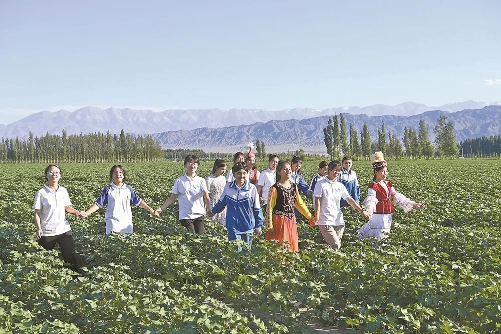 6月27日,“雪莲花”支教团队队员带领学生在天山脚下的棉花地里开展活动,亲近大自然。谢勇 余芳 程威 摄