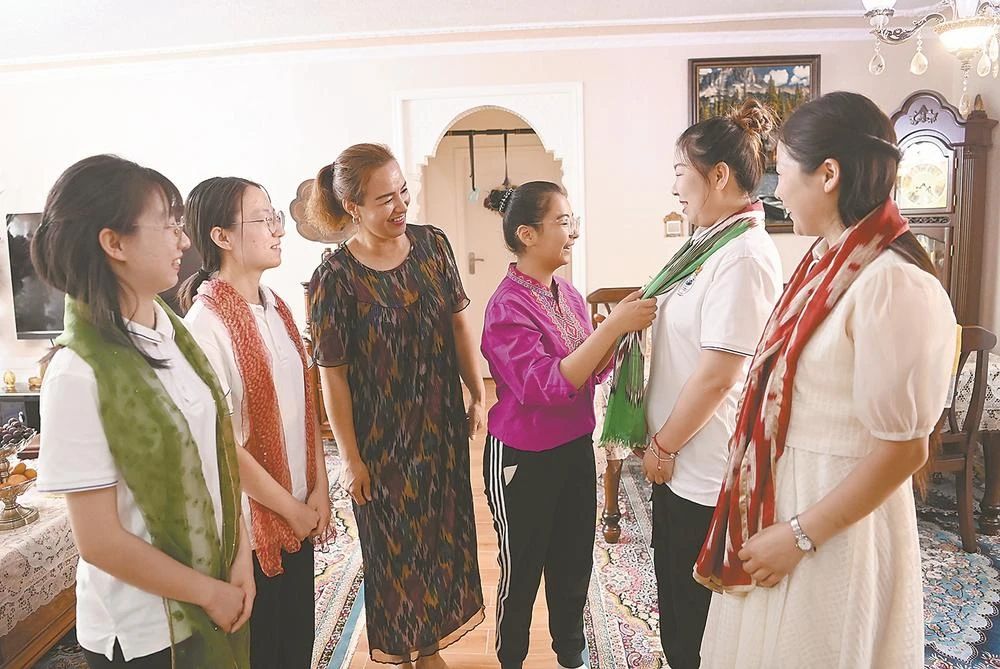 6月27日,学生莫尼莎·艾山江为前来家访的“雪莲花”支教团队队员樊佳瑞佩戴礼仪围巾。谢勇 余芳 程威 摄