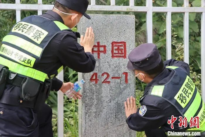 图为民警擦拭界碑。 西双版纳边境管理支队供图